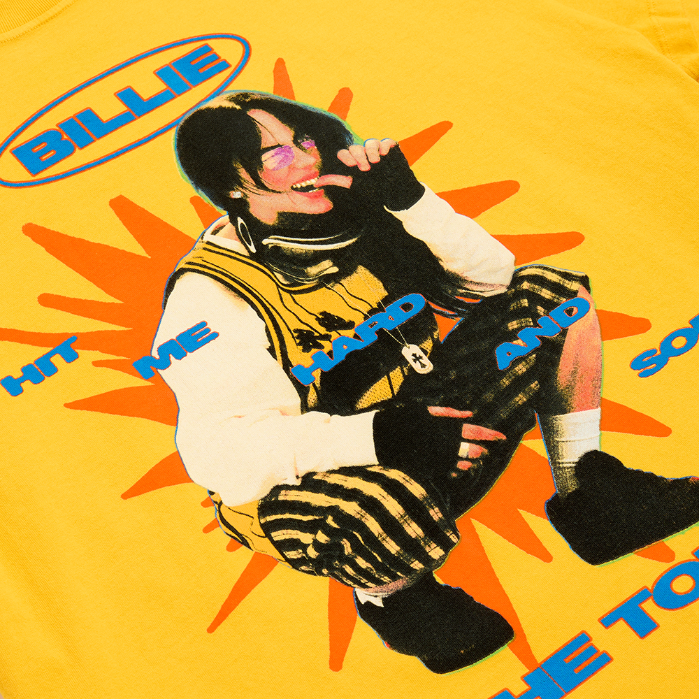 Mustard Yellow T-Shirt Featuring Tour Dates and Graphics from the “HIT ME HARD AND SOFT: THE TOUR.”