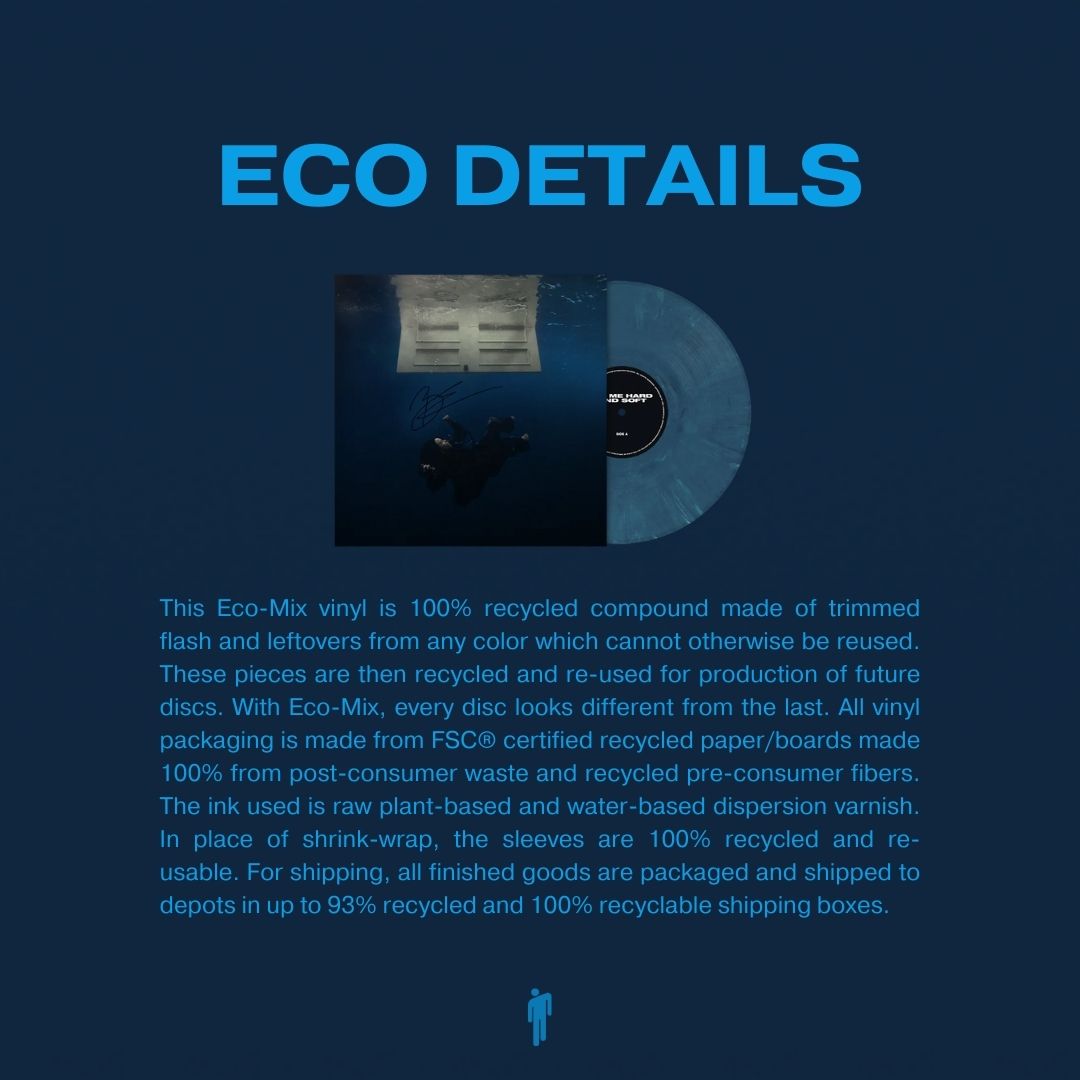 Eco Details: This Eco-Mix vinyl is 100% recycled compound made of trimmed flash and leftovers from any color which cannot otherwise be reused. These pieces are then recycled and re-used for production of future discs. With Eco-Mix, every disc looks different from the last. All vinyl packaging is made from FSC® certified recycled paper/boards made 100% from post-consumer waste and recycled pre-consumer fibers. The ink used is raw plant-based and water-based dispersion varnish. In place of shrink-wrap, the sleeves are 100% recycled and re-usable. For shipping, all finished goods are packaged and shipped to depots in up to 93% recycled and 100% recyclable shipping boxes.