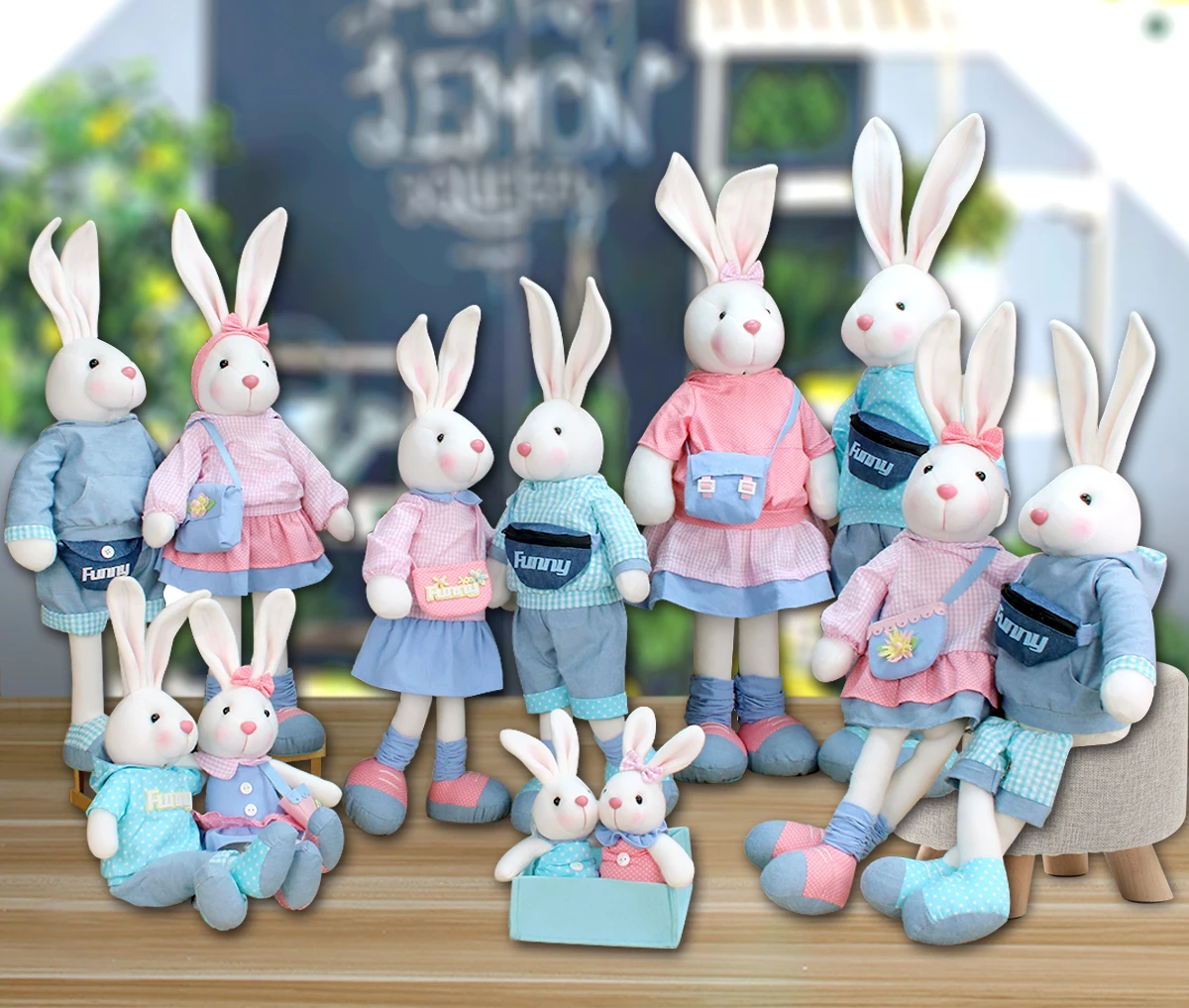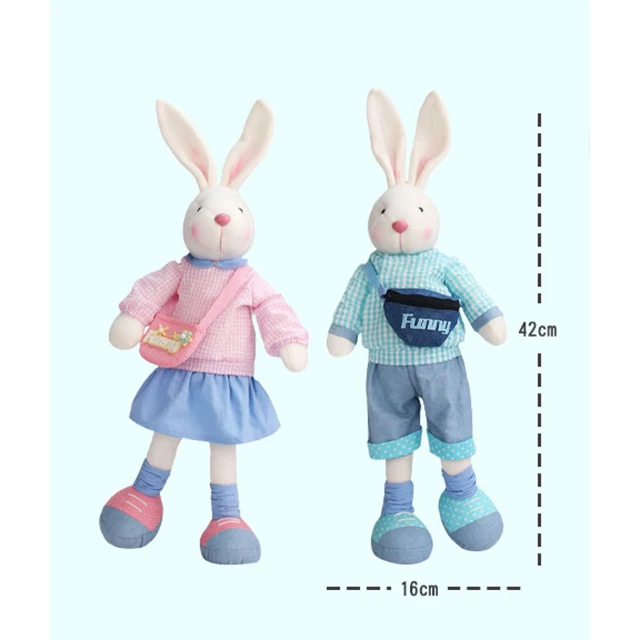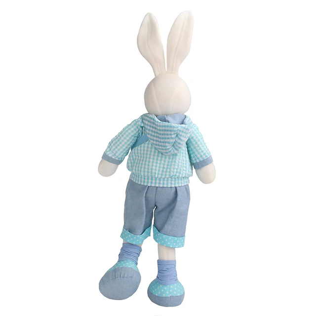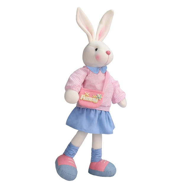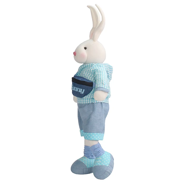 Zaves 42cm Spring Easter Bunny Plush Toy – Stuffed Rabbit Toy with Blue Outfit Funny Waist Bag Design Easter Festival Decoration